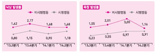 º´µ¿ ³» ÀÔ¿øÈ¯ÀÚÀÇ ´ëÇ¥Àû »ç°íÀÎ ³«»ó°ú ¿å⠹߻ý·üµµ ½Ã¹ü º´µ¿ÀÌ ºñ½Ã¹ü º´µ¿¿¡ ºñÇØ ³·¾Ò´Ù. ƯÈ÷ ½Ã¹ü º´µ¿ÀÇ °æ¿ì ¿å⠹߻ý·üÀÌ »ç¾÷ Àü¿¡ ºñÇØ ¾à 50% °¡·® °¨¼ÒÇÏ´Â °ÍÀ¸·Î ³ªÅ¸³µ´Ù.