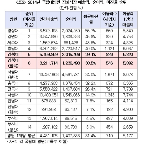 ¸¶ÁøÀ²ÀÌ ³ôÀº °æ»ó´ëº´¿ø, °¿ø´ëº´¿ø, Á¦Áִ뺴¿ø, Ãæ³²´ëº´¿ø, °æºÏ´ëº´¿ø, Ä¥°î°æºÏ´ëº´¿ø Àå·Ê½ÄÀåÀÇ À̿밴 1ÀÎ´ç Æò±Õ ¸ÅÃâ¾×Àº 475¸¸¿ø~606¸¸¿øÀÌ´Ù.