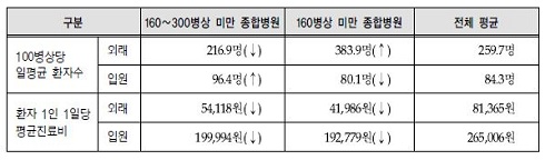 ÀÌ´Â 160¡300º´»ó ¹Ì¸¸ Á¾ÇÕº´¿øÀÇ Áø·á½ÇÀûÀÌ Àüü Æò±Õº¸´Ù ³·°í, 160º´»ó ¹Ì¸¸ Á¾ÇÕº´¿øÀÇ ¿Ü·¡Áø·á ȯÀÚ¼ö´Â Æò±Õº¸´Ù ³ôÀº µ¥ µû¸¥ °ÍÀÌ´Ù. ´Ù¸¸, 160¡300º´»ó ¹Ì¸¸ Á¾ÇÕº´¿øÀÇ ÀÔ¿øÁø·á ȯÀÚ¼ö´Â Æò±Õº¸´Ù ³ô¾Ò´Ù.