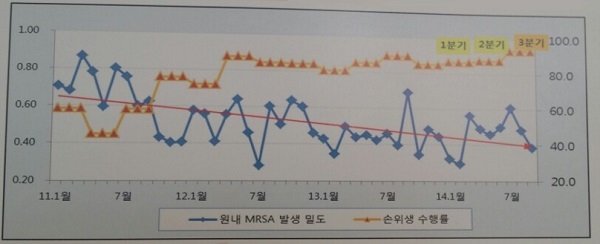 ¿ø³» MRSA ¹ß»ý¹Ðµµ°¡ 0.8¿¡ À̸£´ø 2011³â 1ºÐ±â¿¡´Â ¼Õ À§»ý ¼öÇà·üÀÌ 40~50%¿¡ ¸Ó¹«¸¥ ¹Ý¸é MRSA ¹ß»ý¹Ðµµ°¡ Àý¹ÝÀ¸·Î ¶³¾îÁø 2014³â 3ºÐ±â¿¡´Â ¼Õ À§»ý ¼öÇà·üÀÌ 90.6%¸¦ ±â·ÏÇß´Ù.[¾Æ·¡ Ç¥]