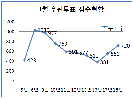 ¹®Á¦´Â ¿ìÆíÅõÇ¥À²ÀÌ´Ù. ÅõÇ¥¿ëÁö°¡ Á¢¼öµÈ Áö ÀÌÆ²Â°ÀÎ 6ÀÏ 1036Ç¥¸¦ Á¦¿ÜÇϰí´Â ½ÃÀÏÀÌ Áö³¯¼ö·Ï ±Þ°ÝÇÑ °¨¼Ò¼¼¸¦ º¸¿´´Ù. 18ÀÏ 720Ç¥°¡ Á¢¼öµÇ¸é¼ ÃÑ 6527Ç¥°¡ ȸ¼ÛµÈ »óȲÀÌ´Ù.