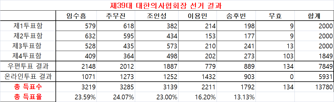 1¹ø ÀÓ¼öÈì Èĺ¸ 2148Ç¥, 2¹ø Ãß¹«Áø Èĺ¸ 2012Ç¥, 3¹ø Á¶Àμº Èĺ¸ 1887Ç¥, 4¹ø 779Ç¥, 5¹ø 889Ç¥·Î Áý°èµÆ´Ù.