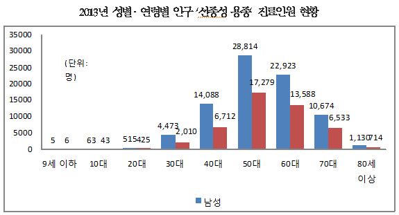 ¿¬·Éº°·Îµµ 50´ë°¡ ¸Å³â 16%¾¿ Áõ°¡Çϸç 2013³â 4¸¸6093¸íÀ» ±â·Ï, ÀüüÀÇ 35%¸¦ Â÷ÁöÇß´Ù. µÚ¸¦ À̾î 60´ë´Â ¸Å³â 16.1%¾¿ Áõ°¡ÇØ 3¸¸6511¸íÀÌ Áø·á¸¦ ¹Þ¾ÒÀ¸¸ç, 40´ë´Â 6%¾¿ ´Ã¾î 2¸¸800¸íÀ¸·Î ´Ã¾ú´Ù.