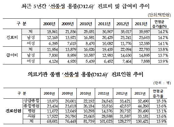 ±¹¹Î°Ç°º¸Çè°ø´Ü(ÀÌ»çÀå ¼º»óö)Àº °Ç°º¸Çè Áø·áºñ Áö±ÞÀڷḦ ºÐ¼®ÇÑ °á°ú '¼±Á¾¼º ¿ëÁ¾(D12.6)'À¸·Î Áø·á ¹ÞÀº À̵éÀÌ 2008³â 6¸¸7742¸í¿¡¼ 2013³â 12¸¸9995¸íÀ¸·Î ¾à 1.9¹è ´Ã¾ú´Ù°í 22ÀÏ ¹àÇû´Ù.