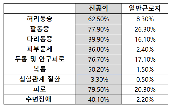 À̿ܿ¡µµ ÆÈÅëÁõ, µÎÅë ¹× ¾È±¸ÇÇ·Î, º¹Åë, ÇǺι®Á¦, ´Ù¸® ÅëÁõ, º¹Åë, ¼ö¸éÀå¾Ö µî¿¡¼ Àü°øÀǵéÀº ÀϹݱٷÎÀÚº¸´Ù ³ôÀº ºñÀ²À» ³ªÅ¸³Â´Ù.[¾Æ·¡ Ç¥]