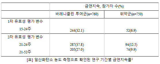 ¿¬±¸ÀÇ 1Â÷ À¯È¿¼º Æò°¡ º¯¼öÀÎ Ä¡·á±â°£ ¸¶Áö¸· 10ÁÖ°£(¿¬±¸ ½ÃÀÛ ÈÄ 15~24ÁÖ)ÀÇ ±Ý¿¬ Áö¼Ó·üÀº è½Ä½º Åõ¿©±ºÀÌ 32.1%·Î À§¾à±º 6.9% ´ëºñ Å©°Ô ³ô¾Ò´Ù.