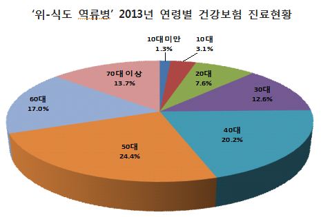 2013³â ±âÁØ Áø·áÀοøÀ» ¿¬·Éº°·Î ³ª´²º¸¸é 50´ë°¡ ÀüüÀÇ 24.4%¸¦ ±â·ÏÇß´Ù. À̾î 40´ë(20.2%), 60´ë(17.0%), 70´ë ÀÌ»ó(13.6%), 30´ë(12.6%), 20´ë(7.6%) ¼øÀ¸·Î ³ªÅ¸³µ´Ù. ÀÌ¿Í °ü·Ã Àϻ꺴¿ø ¼Á¤ÈÆ ±³¼ö(¼Òȱ⳻°ú)´Â "°í¿·®½Ä°ú °íÁö¹æ½Ä °°Àº ¼±¸ÈµÈ ½Ä½À°ü, ºñ¸¸ ¹× ³ë·ÉÀα¸ÀÇ Áõ°¡, À½ÁÖ¿Í Èí¿¬, °úµµÇÑ ½ºÆ®·¹½º, ºÒ±ÔÄ¢ÇÑ ½Ä»ýȰ ½À°ü µîÀ¸·Î Áø·áÀοøÀÌ Áõ°¡Çϰí ÀÖ´Ù"°í ¼³¸íÇß´Ù.