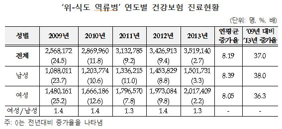 ±¹¹Î°Ç°º¸Çè°ø´Ü(ÀÌ»çÀå ¼º»óö)Àº 5ÀÏ 2009³âºÎÅÍ 2013³â±îÁö °Ç°º¸Çè Áø·áºñ Áö±ÞÀڷḦ ºÐ¼®ÇÑ °á°ú 'À§-½Äµµ ¿ª·ùº´(K21)'ÀÌ 4³â»õ 256¸¸8172¸í¿¡¼ 351¸¸9140¸íÀ¸·Î ¿¬Æò±Õ 8.19%¾¿ 37% Áõ°¡Çß´Ù°í ¹ßÇ¥Çß´Ù.