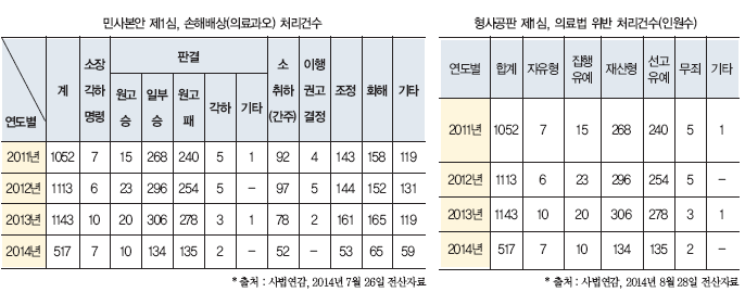 ÀÌ¿¡ ½Åû°Ç¼öµµ ¸Å³â Áõ°¡ÇØ 2012³â 503°Ç¿¡¼ 2013³â 1398°ÇÀ¸·Î 2.5¹è°¡·® ´Ã¾ú°í, 2014³â 7¿ù¸» ±âÁØ 1120°ÇÀÌ Á¢¼öµÆ´Ù. ÀÇ·á»ç°í »ó´ãÀº Áö³ 3³â µ¿¾È ÇÏ·ç Æò±Õ 156°Ç, ÃÑ 8¸¸9550°Ç¿¡ À°¹ÚÇß´Ù. ´Ù¸¸ ¿ä¾ç±â°üÀÇ ÁßÀç ¼ö¶ôÀÌ ÀÖ¾î¾ßÇØ Á¶Á¤°³½Ã°Ç¼ö´Â 40.8%¿¡ ºÒ°úÇÏ´Ù.