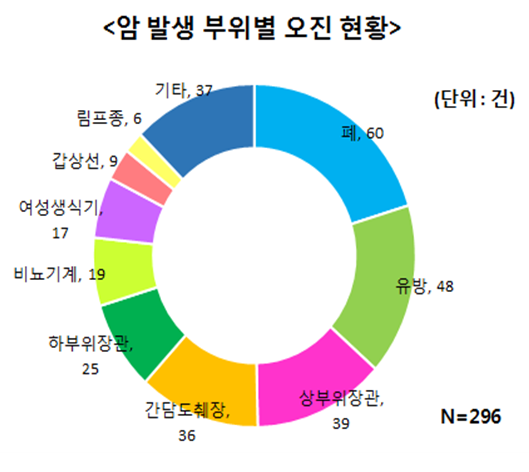 ƯÈ÷ ¡®Æó¾Ï¡¯ ¿ÀÁøÀÌ 60°Ç(20.3%)À¸·Î °¡Àå ¸¹¾ÒÀ¸¸ç À̾î 'À¯¹æ¾Ï'(48°Ç, 16.2%)À¸·Î ³ªÅ¸³µ´Ù. ±× ´ÙÀ½Àº ¼Òȱâ°è ¾ÏÀ¸·Î ¡®»óºÎÀ§Àå°ü¡¯ÀÌ 39°Ç(13.2%), ¡®°£´ãµµÃéÀ塯ÀÌ 36°Ç(12.2%), ¡®ÇϺÎÀ§Àå°ü¡¯ÀÌ 25°Ç(8.4%)À̾ú´Ù.