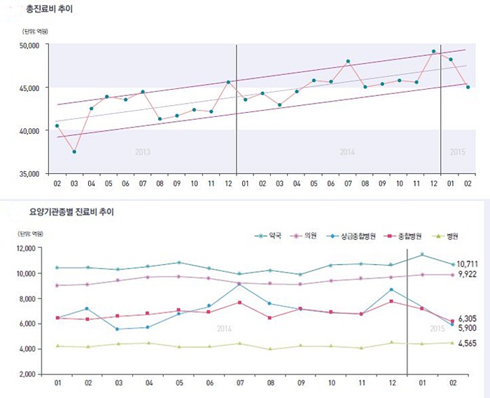 ½ÇÁ¦ Áö³ 2³â¿© °£ÀÇ Áø·áµ¿ÇâÀ» »ìÆìº¸¸é, 2~3¿ù°ú 7~8¿ù »çÀÌ¿¡ Áø·áºñ°¡ Å« Æø Ç϶ôÇÏ´Â °ÍÀ¸·Î ³ªÅ¸³µ´Ù. 2013³â 8¿ù¿¡´Â 7¿ù ´ëºñ 25¸¸¸íÀÇ È¯ÀÚ°¡ ÁÙ¾î Àüü ȯÀÚ¼ö´Â 2515¸¸¸íÀ» ±â·ÏÇßÀ¸¸ç Áø·áºñ´Â 3178¾ï¿øÀÌ ÁÙ¾îµç 4Á¶1607¾ï¿øÀ¸·Î Áý°èµÆ´Ù.