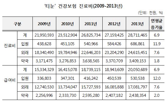 ±¹¹Î°Ç°º¸Çè°ø´Ü(ÀÌ»çÀå ¼º»óö)ÀÌ 2009³âºÎÅÍ 2013³â±îÁö °Ç°º¸Çè Áø·áºñ Áö±ÞÀڷḦ ºÐ¼®ÇÑ °á°ú 'Ƽ´«'À¸·Î Áö±ÞµÈ Áø·áºñ´Â 2009³â 219¾ï5059¸¸¿ø¿¡¼ 2013³â 287¾ï1147¸¸¿øÀ¸·Î ¸Å³â 6.9%¾¿ Áõ°¡Çß´Ù.