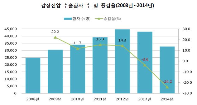°©»ó¼±¾Ï Áø·á¸¦ ¹ÞÀº À̵éÀÌ ²ÙÁØÈ÷ Áõ°¡Çϰí ÀÖ´Â °¡¿îµ¥ ÃÖ±Ù 2³â°£ °©»ó¼±¾ÏÀ¸·Î ¼ö¼úÇÑ È¯ÀÚ´Â ±Þ°ÝÈ÷ ÁÙ¾ú´Ù. 2012³â °©»ó¼±¾Ï °úÀ×Áø´Ü ¹× Áø·á ³í¶õÀÌ ÀÏ¸é¼ ¿ì¼± ¼ö¼úº¸´Ù´Â °æ°ú°üÂû »ç·Ê°¡ ´Ã¾î³µ±â ¶§¹®À¸·Î ºÐ¼®µÈ´Ù.