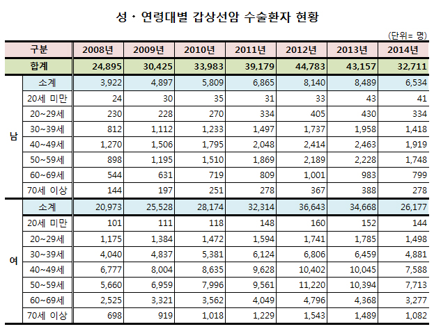 °Ç°º¸Çè½É»çÆò°¡¿ø(¿øÀå ¼Õ¸í¼¼)ÀÌ '°©»ó¼±¾Ï(C73)'À¸·Î Áø´Ü¹ÞÀº °Ç°º¸Çè ½É»ç°áÁ¤ÀÚ·á 2008³âºÎÅÍ 2014³â±îÁö 7³âºÐÀ» ºÐ¼®ÇÑ °á°ú, °©»ó¼±¾ÏÀ¸·Î Áø·á¸¦ ¹ÞÀº ÀοøÀº 2014³â ±âÁØ 34¸¸1175¸í¿¡ À̸£·¶´Ù.