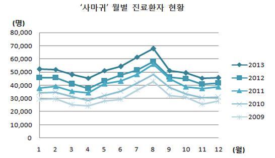 ƯÈ÷ À̵éÀÌ º´¿øÀ» ã´Â ½Ã±â°¡ 4¿ùÀ» ±âÁ¡À¸·Î ±Þ°ÝÈ÷ Áõ°¡ÇØ 8¿ù Á¤Á¡À» Âï°í, 9¿ù ±Þ°¨ÇØ °¡À»°ú °Ü¿ï¿¡´Â Å« º¯È°¡ ¾ø´Â ¾ç»óÀ» Áö³ 5³â°£ µÇÇ®ÀÌÇÏ´Â °ÍÀ¸·Î ³ªÅ¸³µ´Ù.