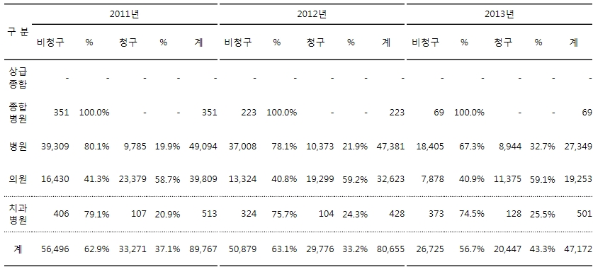 ÀÌ´Â 17ÀÏ ´ëÇѸ¶ÃëÅëÁõÀÇÇÐȸ°¡ Àü±¹ ÀÇ·á±â°üÀÇ °Ç°º¸Çè½É»çÆò°¡¿ø ¿ä¾ç±Þ¿©ºñ¿ë û±¸ ÀÚ·á Áß Áø·áÀÏ ±âÁØ 2011³â 1¿ù 1ÀϺÎÅÍ 2013³â 12¿ù 31ÀϱîÁö Áø·á ³»¿ªÀ» ºÐ¼®ÇÑ °á°ú ÆÄ¾ÇµÆ´Ù.