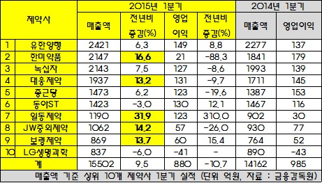 ±¹³» Á¦¾à»çµéÀÇ ¿Ã 1ºÐ±â ½ÇÀûÀÌ °ø°³µÇ¸é¼ »óÀ§ 10°³ Á¦¾à»ç(¸ÅÃâ¾× ±âÁØ) Áß 5°÷ÀÌ Àü³â ´ëºñ 10%ÀÌ»ó ¸ÅÃâ »ó½Â¿¡ ¼º°øÇÑ °ÍÀ¸·Î ³ªÅ¸³µ´Ù.