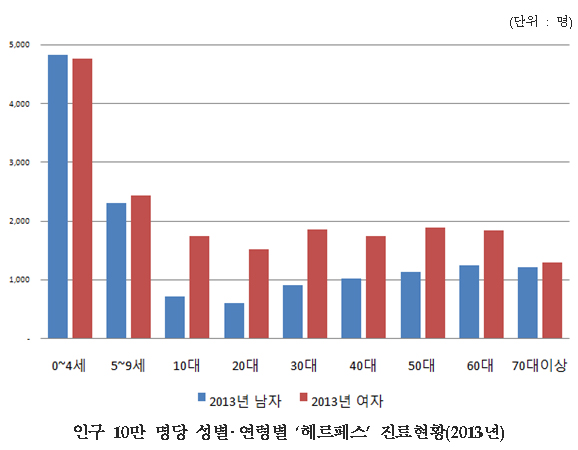 ±¹¹Î°Ç°º¸Çè°ø´Ü(ÀÌ»çÀå ¼º»óö)ÀÌ 2009³âºÎÅÍ 2013³â±îÁö °Ç°º¸Çè Áø·áºñ Áö±ÞÀڷḦ ºÐ¼®ÇÑ °á°ú, Ç츣Æä½º¹ÙÀÌ·¯½º °¨¿° Áø·áÀοøÀº 2009³â 57¸¸1677¸í¿¡¼ 2013³â¿¡ 75¸¸3439¸íÀ¸·Î ¿¬Æò±Õ 7.15% Áõ°¡Çß´Ù.