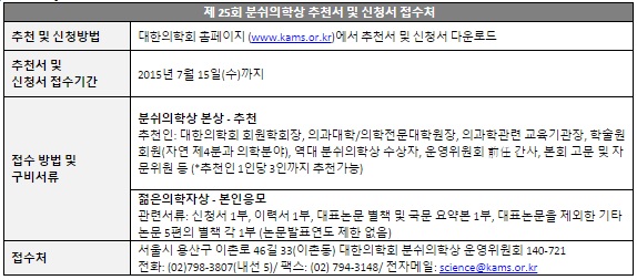 Çѱ¹ÀÇ ³ëº§ÀÇÇлóÀ¸·Î ºÒ¸®´Â ºÐ½¬ÀÇÇлóÀº Çѱ¹ ÀÇÇÐ ¿¬±¸ÀÚµé »çÀÌ¿¡¼ ¿µ¿¹·Ó°í ±ÇÀ§ ÀÖ´Â »óÀ¸·Î ÀÚ¸®¸Å±èÇß´Ù. ºÐ½¬ÀÇÇÐ»ó º»»óÀº ¼ö»óÀÚ¿¡°Ô´Â »óÆÐ ¹× ¸Þ´Þ°ú ÇÔ²² »ó±Ý 5000¸¸¿øÀÌ ÁÖ¾îÁø´Ù. ¡®ÀþÀºÀÇÇÐÀÚ»ó¡¯Àº ±âÃÊ 1¸í, ÀÓ»ó 1¸í µî ÃÑ 2¸íÀ» ¼±Á¤, °¢°¢ »óÆÐ¿Í ¸Þ´Þ, »ó±Ý 2000¸¸¿øÀÌ ¼ö¿©µÈ´Ù. ºÐ½¬ÀÇÇлóÀÇ º»»ó Ãßõ¼¿Í ÀþÀºÀÇÇÐÀÚ»ó ½Åû¼´Â ´ëÇÑÀÇÇÐȸ ȨÆäÀÌÁö(www.kams.or.kr)¿¡¼ ´Ù¿î·Îµå °¡´ÉÇϸç, ¿ìÆíÀ̳ª À̸ÞÀÏ(science@kams.or.kr)À» ÅëÇØ Á¢¼öÇÏ¸é µÈ´Ù.