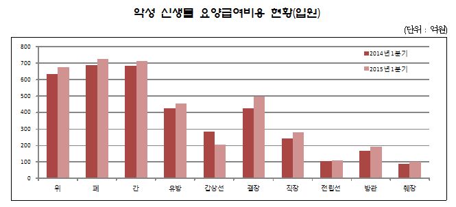 ¿ä¾ç±Þ¿©ºñ¿ëÀÌ °¡Àå ¸¹ÀÌ Áõ°¡ÇÑ Á¾º°Àº Ä¡°úº´¿øÀ¸·Î Àü³â µ¿±â¿Í ºñ±³Çϸé 24% ¾à 78¾ï¿øÀÌ ´Ã¾ú°í, Áõ°¡¾×À¸·Î´Â ¿ä¾çº´¿øÀ» Æ÷ÇÔÇÑ º´¿øÀÌ 2Á¶34¾ï¿øÀ¸·Î ¾à 9.4% »ó½ÂÇß´Ù.