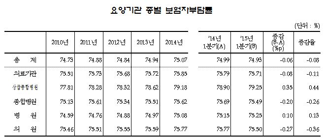 ¹Ý¸é ¿ä¾ç±Þ¿©ºñ¿ë Áß º¸ÇèÀÚ ºÎ´ã·üÀº Àü³â µ¿±â´ëºñ 0.06%p ÁÙ¾îµç 74.93%·Î È®ÀεƴÙ. Á¾º°·Î´Â »ó±ÞÁ¾º´¿¡ ´ëÇÑ ºÎ´ãÀÌ 75.49%·Î 0.35% ´Ã¾ú°í, Á¾º´¿¡ ´ëÇØ¼´Â 0.2% ¿ÏȵƴÙ. ÀÇ¿ø¿¡ ´ëÇÑ ºÎ´ãµµ 0.27%p ÁÙ¾ú´Ù.