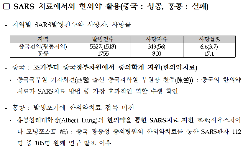 ÇÑÀÇÇùÀº "»ç½º â±È ´ç½Ã Áß±¹Àº Á¶¼ÓÈ÷ º´ÇàÄ¡·á¸¦ ½Ç½ÃÇØ È¿À²ÀûÀ¸·Î ȯÀÚ¸¦ °ü¸®ÇßÁö¸¸ È«ÄáÀÇ °æ¿ì ±×·¯Áö ¸øÇß´Ù"¸ç "2004³â »ç½º »ç·Ê¸¦ ÅëÇØ ÇÑÀǾà Ȱ¿ëÀÌ ½ÅÁ¾°¨¿°º´ ȯÀÚ Ä¡·á¿¡ È¿°ú°¡ ÀÖÀ½ÀÌ È®ÀεƴÙ"°í ¼³¸íÇß´Ù.
