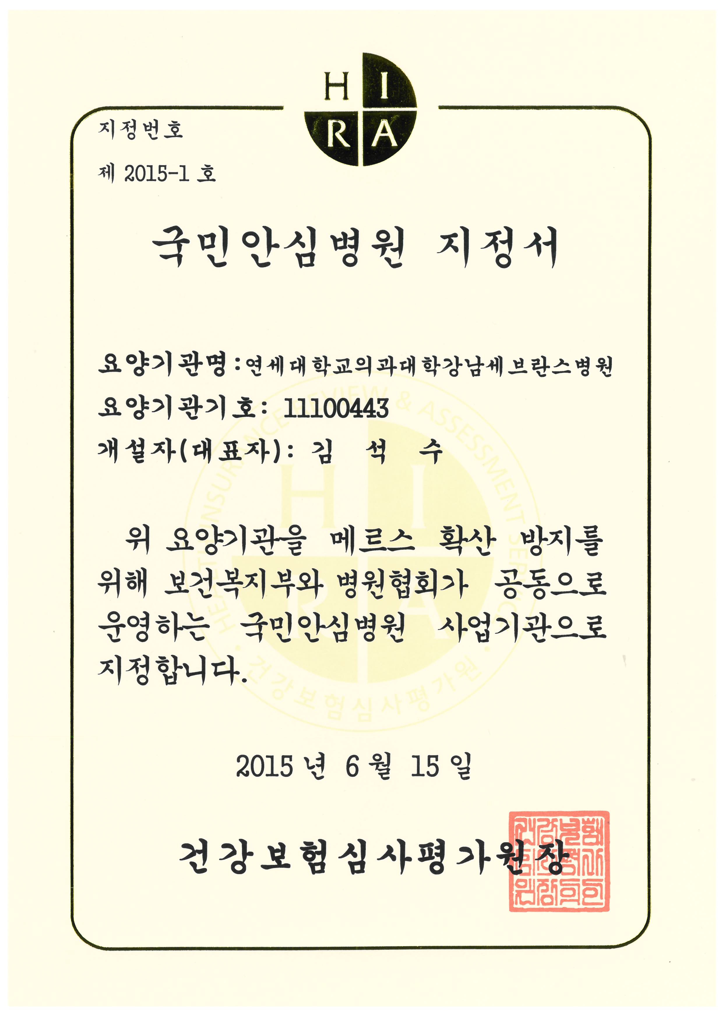 ¿¬¼¼´ëÇб³ °³²¼¼ºê¶õ½ºº´¿øÀÌ ¸Þ¸£½º(MERS‧Áßµ¿È£Èí±âÁõÈıº) °ÆÁ¤ÀÌ ¾ø´Â ¡®±¹¹Î¾È½Éº´¿ø¡¯ ù ÁöÁ¤¼¸¦ ¹Þ¾Ò´Ù.