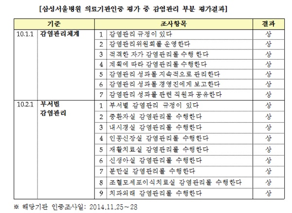 Á¤ÀÇ´ç Á¤ÁøÈÄ ÀÇ¿ø[»çÁø]ÀÌ 17ÀÏ º¸°Çº¹ÁöºÎ·ÎºÎÅÍ ¹ÞÀº 2014³â »ï¼º¼¿ïº´¿ø ¡®ÀÇ·á±â°üÀÎÁõ¡¯ Æò°¡ °á°ú¿¡ µû¸£¸é, »ï¼º¼¿ïº´¿øÀº °¨¿°°ü¸®Æò°¡ ¸ðµç ¿µ¿ª¿¡¼ »ó¡¤Áß¡¤ÇÏ Áß ÃÖ°í Æò°¡¸¦ ¹Þ¾Ò´Ù.