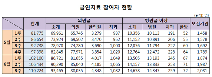 ±¹¹Î°Ç°º¸Çè°ø´Ü(ÀÌ»çÀå ¼º»óö)ÀÌ ÀÛ¼ºÇÑ ±Ý¿¬Áö¿ø»ç¾÷ 5~6¿ù Âü¿©ÇöȲ ÀÚ·á¿¡ µû¸£¸é 5¿ù ù°ÁÖ 8¸¸1775¸íÀÌ´ø ±Ý¿¬Âü¿©ÀÚ°¡ 6¿ù 21ÀÏ ÇöÀç 11¸¸224¸íÀ» ±â·ÏÇß´Ù.