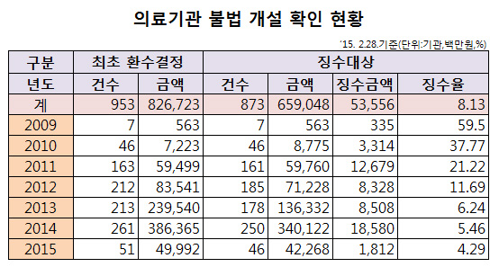±¹¹Î°Ç°º¸Çè°ø´Ü(ÀÌ»çÀå ¼º»óö)ÀÌ ÃÖ±Ù °ø°³ÇÑ ÀÇ·á±â°ü ºÒ¹ý°³¼³ ÇöȲÀ» »ìÆìº¸¸é 2009³âºÎÅÍ 2015³â 3¿ù±îÁö »ç¹«À庴¿øÀ¸·Î È®ÀÎµÈ °Ç¸¸ 873°ÇÀ̾ú´Ù. ȯ¼ö°¡ °áÁ¤µÈ ±Ý¾×Àº 6590¾ï4800¿©¸¸¿ø¿¡ ´ÞÇß´Ù.