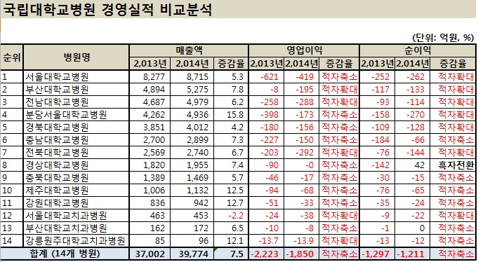 º¸°ÇÀÇ·á ºÐ¼®Æò°¡ Àü¹®»çÀÌÆ®ÀÎ ÆÊ½ºÄÚ¾î(www.pharmscore.com)´Â 8ÀÏ ±âȹÀçÁ¤ºÎ °ø°ø±â°ü °æ¿µÁ¤º¸ÀڷḦ Åä´ë·Î ±¹³» 14°³ ±¹¸³´ëÇб³º´¿ø '2014³â °æ¿µ½ÇÀû'À» ºÐ¼®ÇÑ °á°ú¸¦ ³»³ù´Ù.