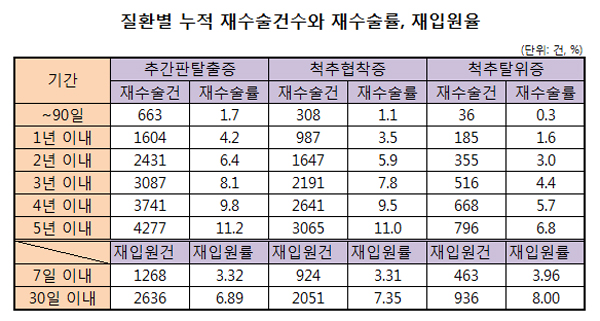 2008³â Ãß°£ÆÇÅ»ÃâÁõ°ú ôÃßÇùÂøÁõ, ôÃßÅ»À§ÁõÀ¸·Î ôÃß¼ö¼úÀ» ¹ÞÀº 7¸¸7912¸í¿¡ ´ëÇÑ Àç¼ö¼ú ¹× ÀçÀÔ¿ø ¿©ºÎ¸¦ ºÐ¼®ÇÑ °á°ú, 90ÀÏ À̳» Àç¼ö¼úÀ» ¹ÞÀº Ãß°£ÆÇÅ»ÃâÁõ ȯÀÚ´Â ÀüüÀÇ 1.7%¿´À¸¸ç ôÃßÇùÂøÁõ°ú ôÃß Å»ÃëÁõÀº °¢°¢ 1.1%¿Í 0.3%¿´´Ù.