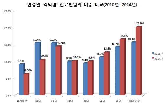 ¿¬·Éº° ȯÀÚ¼ö´Â 2014³â ±âÁØ 50´ë°¡ 28¸¸9252¸íÀ¸·Î °¡Àå ¸¹¾Ò°í, 20´ë°¡ 27¸¸6192¸íÀ¸·Î µÚ¸¦ À̾ú´Ù. ÇÏÁö¸¸ 4³â Æò±Õ Áõ°¡À²Àº 70´ë ÀÌ»óÀÌ 20.4%·Î °¡Àå Å©°Ô Áõ°¡Çß´Ù.