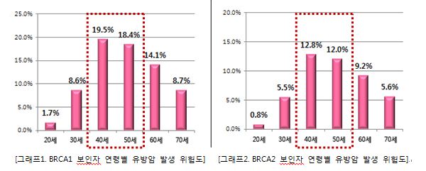 ƯÈ÷ BRCA1¿Í BRCA2 º¸ÀÎÀÚÀÇ °æ¿ì 40¼¼ ¶§ À¯¹æ¾Ï ¹ß»ý·üÀÌ °¢°¢ 19.5%¿Í 12.8%, 50¼¼ ¶§ 18.4%¿Í 12%·Î ³ô¾ÒÀ¸¸ç, ÀÌÈÄ Â÷Ãû °¨¼Ò¼¼¸¦ º¸ÀÌ´Â °ÍÀ» ±Ô¸íÇß´Ù.