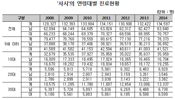 ±¹¹Î°Ç°º¸Çè°ø´ÜÀÌ '»ç½Ã(H50.0~50.9)'¿¡ ´ëÇÑ °Ç°º¸Çè Áø·áºñ Áö±ÞÀڷḦ ºÐ¼®ÇÑ °á°ú, ¼Ò¾ÆÀÇ ¾à 2%¿¡¼ »ç½Ã°¡ ¹ß°ßµÆÀ¸¸ç 2014³â ±âÁØ »ç½Ã Áø·áÀοø 13¸¸4597¸í Áß 10´ë ÀÌÇÏ´Â 11¸¸4332¸í¿¡ ´ÞÇß´Ù.
