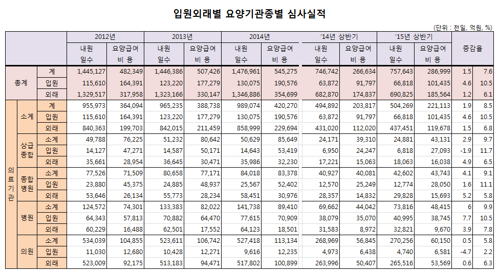 °Ç°º¸Çè½É»çÆò°¡¿ø(¿øÀå ¼Õ¸í¼¼)ÀÌ 31ÀÏ °ø°³ÇÑ '2015³âµµ »ó¹Ý±â °Ç°º¸Çè Áø·áºñ Åë°èÁöÇ¥'¿¡ µû¸£¸é Àüü ¿ä¾ç±â°ü¿¡°Ô Áö±ÞµÈ °Ç°º¸Çè ¿ä¾ç±Þ¿©ºñ¿ëÀº ÃÑ 28Á¶6999¾ï¿øÀ¸·Î Àü³â µ¿±â ´ëºñ 7.6% Áõ°¡Çß´Ù.