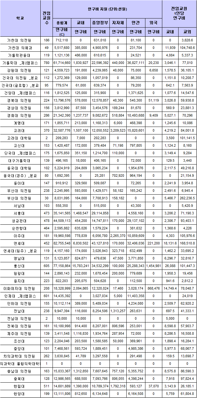 Àü±¹ Àǰú´ëÇÐ ¹× ÀÇÇÐÀü¹®´ëÇпøÀÇ ¿¬±¸ºñ ¼öÇý ½ÇÀû Áý°è °á°ú, ¿¬¼¼´ë´Â ¡ã±³³» ¿¬±¸ºñ 68¾ï¿ø ¡ãÁß¾ÓÁ¤ºÎ ¿¬±¸ºñ 431¾ï¿ø ¡ãÁöÀÚü 1¾ï7000¸¸¿ø ¡ã¹Î°£ 324¾ï¿ø ¡ã¿Ü±¹ 2¾ï2000¸¸¿ø µî ÃÑ 827¾ï¿ø °¡·®À» ¹ÞÀº °ÍÀ¸·Î ³ªÅ¸³µ´Ù.