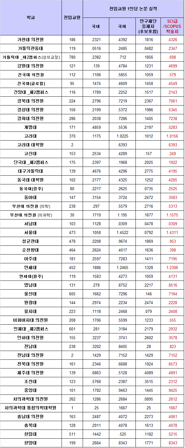 ÀüÀÓ±³¿ø 1Àδç SCI±Þ¡¤SCOPUS °ÔÀç ³í¹®ÀÌ 1Æí ÀÌ»óÀÎ ´ëÇÐÀº 4°÷ »ÓÀ̾ú´Ù. ¼¿ï´ë°¡ 1.4ÆíÀ¸·Î °¡Àå ¸¹¾Ò°í ¿¬¼¼´ë 1.2Æí, ºÎ»ê´ëÀÇÀü¿ø 1.1Æí, °í·Á´ë 1.0ÆíÀ¸·Î Áý°èµÆ´Ù.
