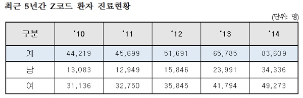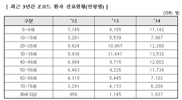 »õ´©¸®´ç ¹ÚÀ±¿Á ÀÇ¿ø(±¹È¸ º¸°Çº¹ÁöÀ§¿øÈ¸)ÀÌ °Ç°º¸Çè½É»çÆò°¡¿ø¿¡¼ Á¦ÃâÇÑ ÀڷḦ ºÐ¼®ÇÑ °á°ú, 2010³â 4¸¸4219¸íÀ̾ú´ø ZÄÚµå ȯÀÚ°¡ 2014³âµµ¿¡´Â 8¸¸3609¸íÀÎ °ÍÀ¸·Î ³ªÅ¸³µ´Ù.