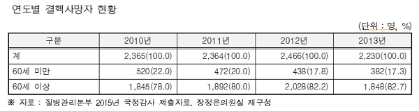ÃÖ±Ù 3³â °£ ¸Å³â 60¼¼ ÀÌ»óÀÇ »ç¸ÁÀÚ°¡ 80% ÀÌ»óÀÎ °ÍÀ» ºñÃ纼 ¶§ ³ëÀÎÃþ¿¡ ´ëÇÑ º°µµÀÇ °áÇÙ ´ëÃ¥ ¼ö¸³ÀÌ ÇÊ¿äÇÑ °ÍÀ¸·Î ºÐ¼®µÈ´Ù.