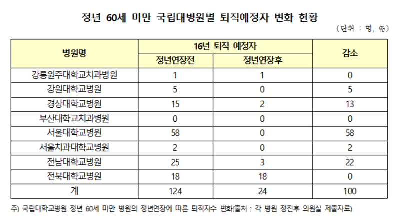 Á¤³âÀÌ ÀÌ¹Ì 60¼¼ÀÎ ±¹¸³´ëº´¿øÀ» Á¦¿ÜÇϰí, Á¤³â¿¬Àå ÀοøÀÌ ÀÖ´Â ±¹¸³´ëº´¿ø 8°÷ÀÌ Á¤³âÀ» 60¼¼·Î Àǹ«ÈÇÒ °æ¿ì, 2016³â ÅðÁ÷ÀÌ ¿¹Á¤µÆ´Ù°¡ Á¤³âÀÌ ¿¬ÀåµÇ´Â ÀοøÀº 100¸í¿¡ ºÒ°úÇß´Ù. ÀÌ´Â ±¹¸³´ëº´¿ø Àüü Á¤¿øÀÇ 0.38%¿¡ ºÒ°úÇÑ ¼öÄ¡´Ù.