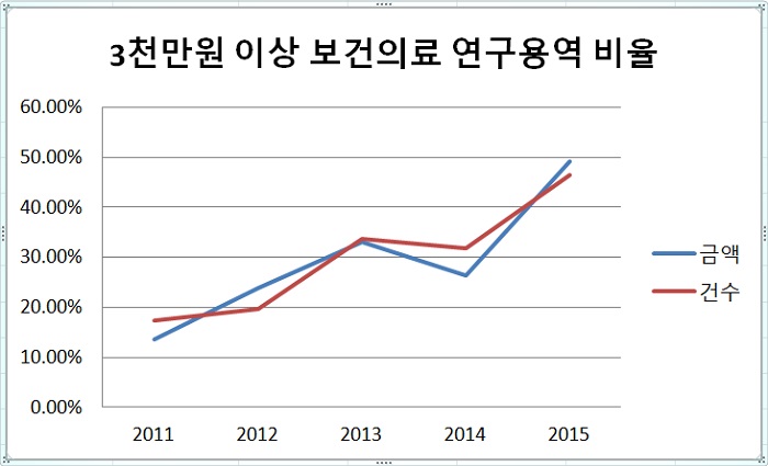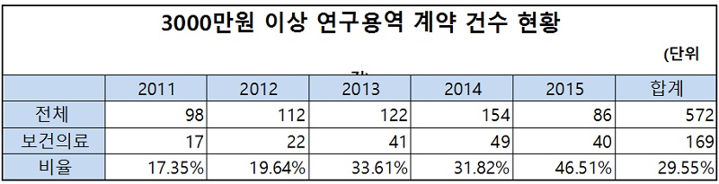 2015³â 3000¸¸¿ø ÀÌ»ó ÃÑ ¿¬±¸¿ë¿ª °Ç¼ö´Â 86°ÇÀ¸·Î ±× Áß 40°ÇÀÌ º¸°ÇÀÇ·á ºÐ¾ß¿´´Ù. 46.51% ºñÁßÀ¸·Î ÃÖ±Ù 5³â °£ °¡Àå ³ôÀº ¼öÁØÀ̾ú´Ù.
