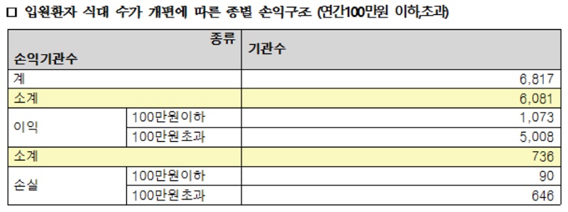 ½ÇÁ¦ º¸°Çº¹ÁöºÎ ¿ª½Ã ¡®ÀÔ¿øÈ¯ÀÚ ½Ä´ë ¼ö°¡ °³Æí¿¡ µû¸¥ Á¾º° ¼ÕÀͱ¸Á¶¡¯ºÐ¼® °á°ú ½Ä´ë¼ö°¡ Á¶Á¤À¸·Î ½Ä´ëû±¸ ÀÇ·á±â°ü 6817°³¼Ò Áß 6081°³¼Ò(88.2%)´Â ÀÌÀÍÀ» º¸°í, 736°³¼Ò(10.8%)°¡ ÇöÀ纸´Ù ¼ÕÇØ¶ó°í ºÐ¼®Çß´Ù.