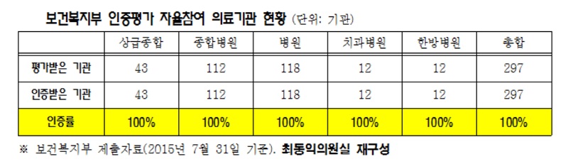 »õÁ¤Ä¡¹ÎÁÖ¿¬ÇÕ ÃÖµ¿ÀÍ ÀÇ¿ø(±¹È¸ º¸°Çº¹ÁöÀ§¿øÈ¸)¿¡ µû¸£¸é ÀÎÁõÁ¦µµ°¡ ½ÃÀÛµÈ 2011³âºÎÅÍ 2015³â 7¿ù¸»±îÁö Æò°¡¿¡ ÀÚÀ² Âü¿©ÇÑ º´¿ø Áß Å»¶ôÇÑ °÷Àº ´Ü ÇÑ °÷µµ ¾ø¾ú´Ù. ÀÎÁõ·üÀÌ 100%¶ó´Â ¾ê±â´Ù.