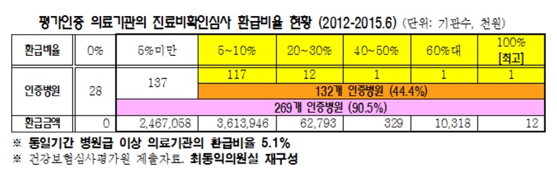 2012³âºÎÅÍ 2015³â 6¿ù±îÁö ÀÎÁõº´¿øÀÇ Áø·áºñÈ®ÀÎ½É»ç °á°ú¸¦ »ìÆìº» °á°ú Àüü ÀÎÁõº´¿ø(297°³) Áß 90% ÀÌ»óÀÎ 269°³ ÀÎÁõº´¿øÀÌ È¯Àڵ鿡°Ô ÃÑ 61¾ï5000¸¸¿øÀÇ Áø·áºñ¸¦ °ú´Ùû±¸ÇÑ °ÍÀ¸·Î ³ªÅ¸³µ´Ù.