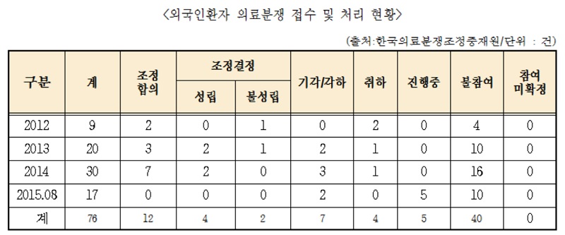 ½ÇÁ¦, Çѱ¹ÀÇ·áºÐÀïÁ¶Á¤ÁßÀç¿øÀÌ Á¦ÃâÇÑ ¡®¿Ü±¹ÀΠȯÀÚ ÀÇ·á°ü±¤ ÇÇÇØ Á¢¼ö ¹× ±¸Á¦ ÇöȲ¡¯¿¡ µû¸£¸é, ¿Ü±¹ÀΠȯÀÚÀÇ Á¶Á¤ºÐÀï ½Åû °ÇÀº ÃÑ 76°ÇÀÌ´Ù.