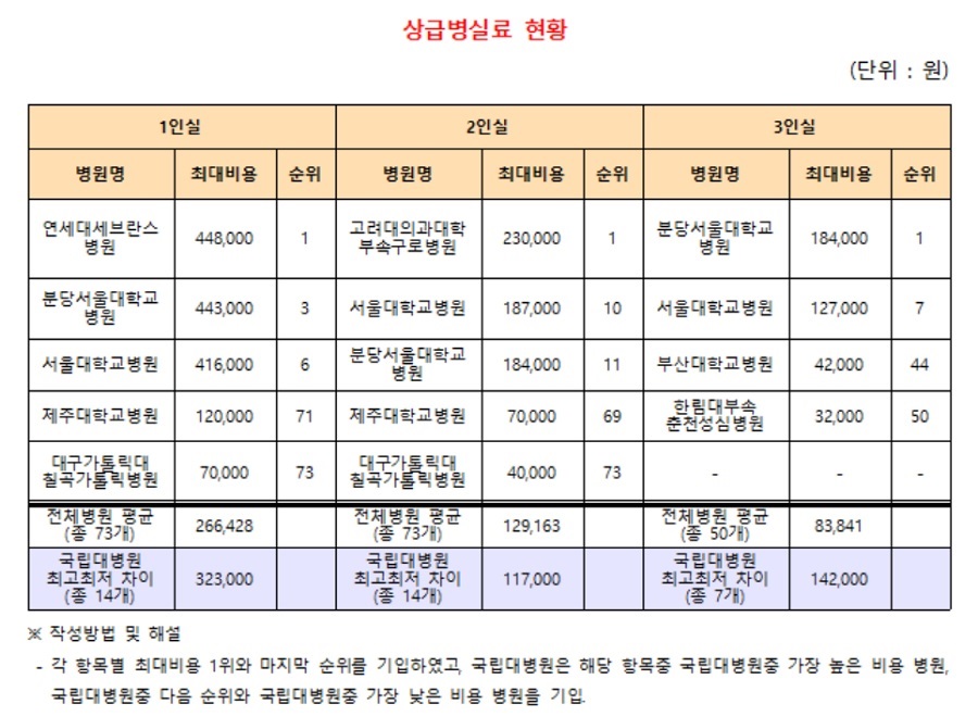 ¿ì¼±, 1ÀÎ½Ç »ó±Þº´½Ç·áÀÇ °æ¿ì ±¹¸³´ëº´¿ø Áß ºÐ´ç¼¿ï´ëº´¿øÀÌ 44¸¸¿øÀ¸·Î °¡Àå ºñ½Õ´Ù. 1ÀνÇÀÌ ÀÖ´Â 73°³ º´¿ø Áß 3À§¿¡ ÇØ´çÇÏ´Â °¡°ÝÀ̾ú´Ù.