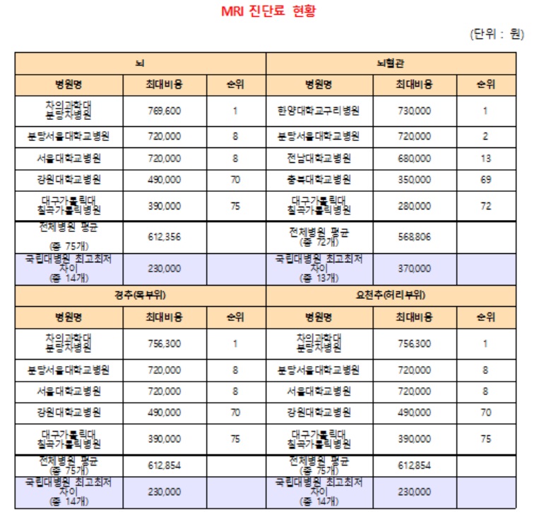 MRI Áø´Ü·á´Â ³ú, ³úÇ÷°ü, °æÃß, ¿äõÃß ÃÔ¿µ ¸ðµÎ ±¹¸³´ëº´¿ø Áß ºÐ´ç¼¿ï´ëº´¿øÀÇ Áø·áºñ°¡ °¡Àå ºñ½Õ´Ù.