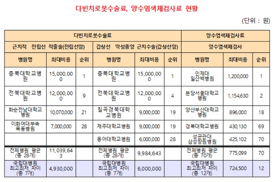 ÀϺΠº´¿ø¸¸ ½ÃÇàÇϰí ÀÖ´Â ´ÙºóÄ¡·Îº¿ ¼ö¼ú·á´Â ÃæºÏ´ëº´¿øÀÌ 1500¸¸¿ø¿¡ ´ÞÇØ °¡Àå ³ô¾Ò´Ù. °¡Àå ³·Àº ȼøÀü³²´ëº´¿øÀº 1007¸¸¿øÀ¸·Î, µÎ º´¿ø°£ÀÇ °ÝÂ÷´Â 493¸¸¿øÀ̾ú´Ù.