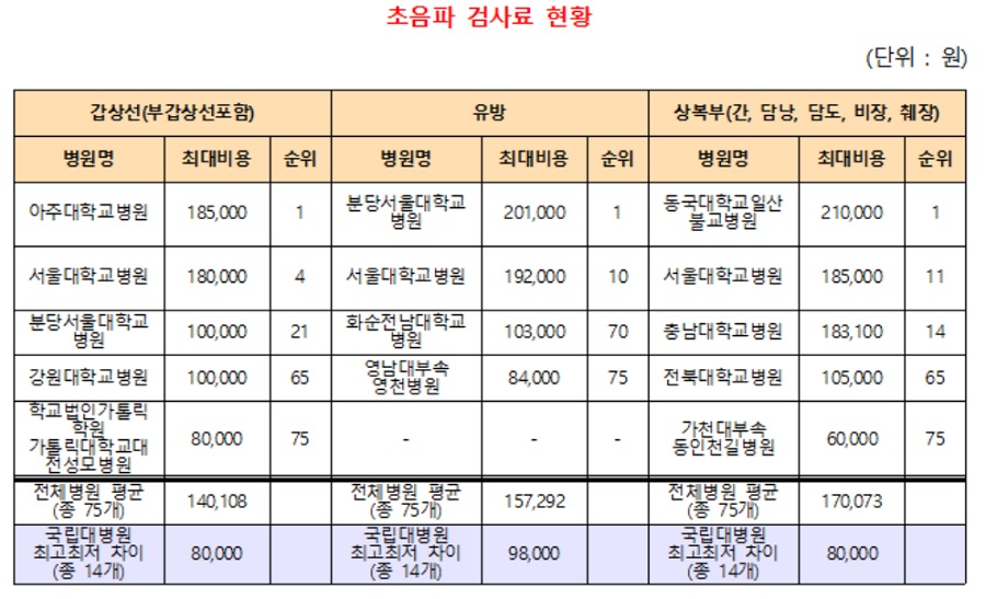 À̿ܿ¡ ÃÊÀ½ÆÄ °Ë»ç·áÀÇ °æ¿ìµµ °Ë»ç ºÎºÐº°·Î Àû°Ô´Â 8¸¸¿ø, ¸¹°Ô´Â 10¿©¸¸¿øÀÇ °Ë»çºñ¿ëÀÌ Â÷À̰¡ ³µ´Ù.
